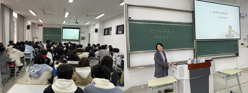 pp电子官方网站思想道德与法治教研室和法治中国建设研究中心的老师们精心备课,集体研讨,认真上课,立足《思想道德和法治》课程教学,把宪法精神及时有效地融入课堂教学,入脑入心,增强立德树人的实效性和及时性,运用宪法案例教学和课堂互动,有效提升学生的到课率、前排就坐率、抬头率和点头率。思想道德与法治教研室主任邵长鹏副教授围绕《“马锡五审判方式”的司法内涵与时代价值》、宋洁教授围绕《宪法宣誓与宪法精神》、罗薇副教授围绕《科学把握新时代“枫桥经验”的内涵要义》、刘妤博士围绕《”今日说法”中的宪法精神》、孙秀丽博士围绕《宪法走进现实生活》、黄志兰老师围绕《宪法发展历史》分别做了专题授课。